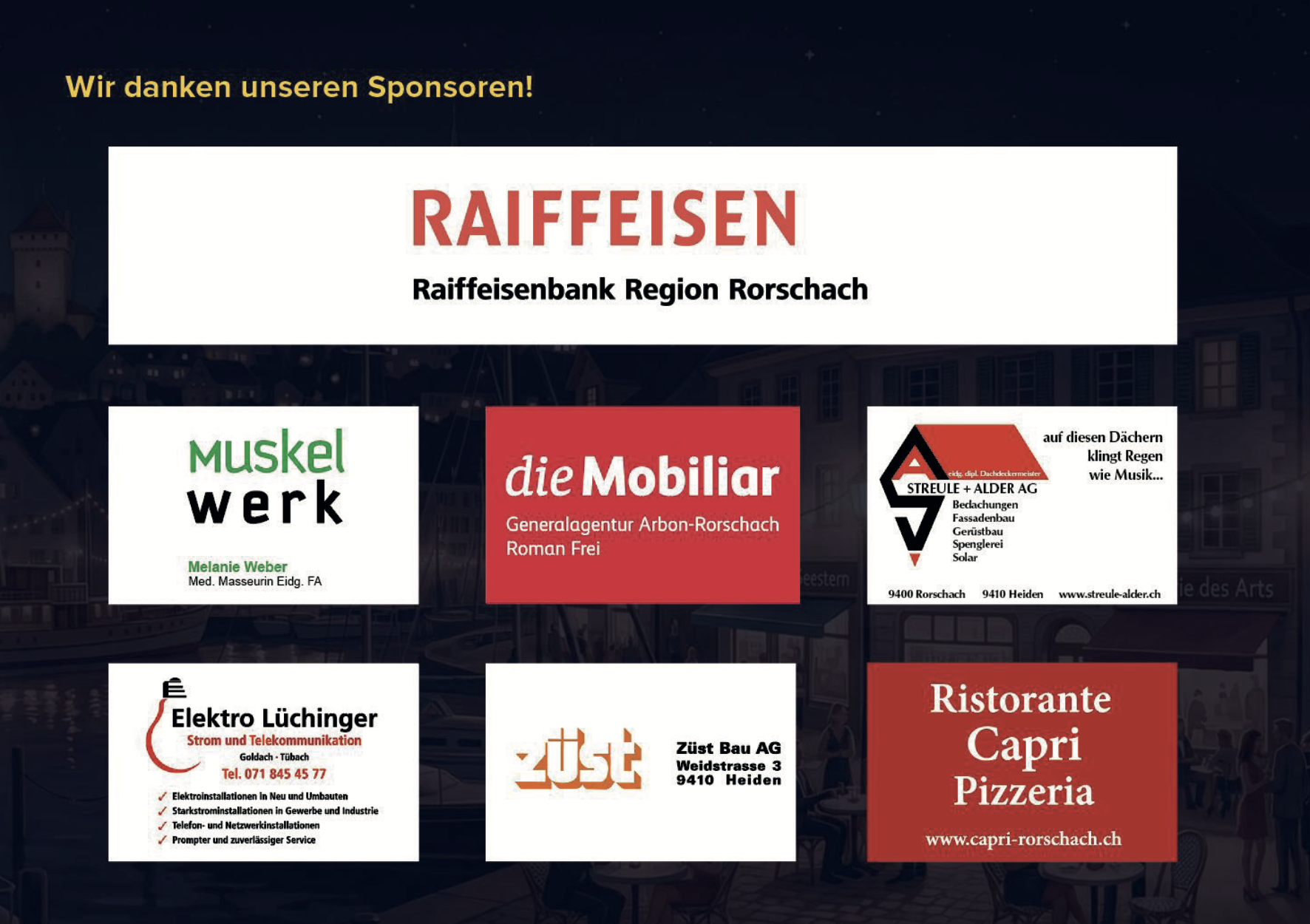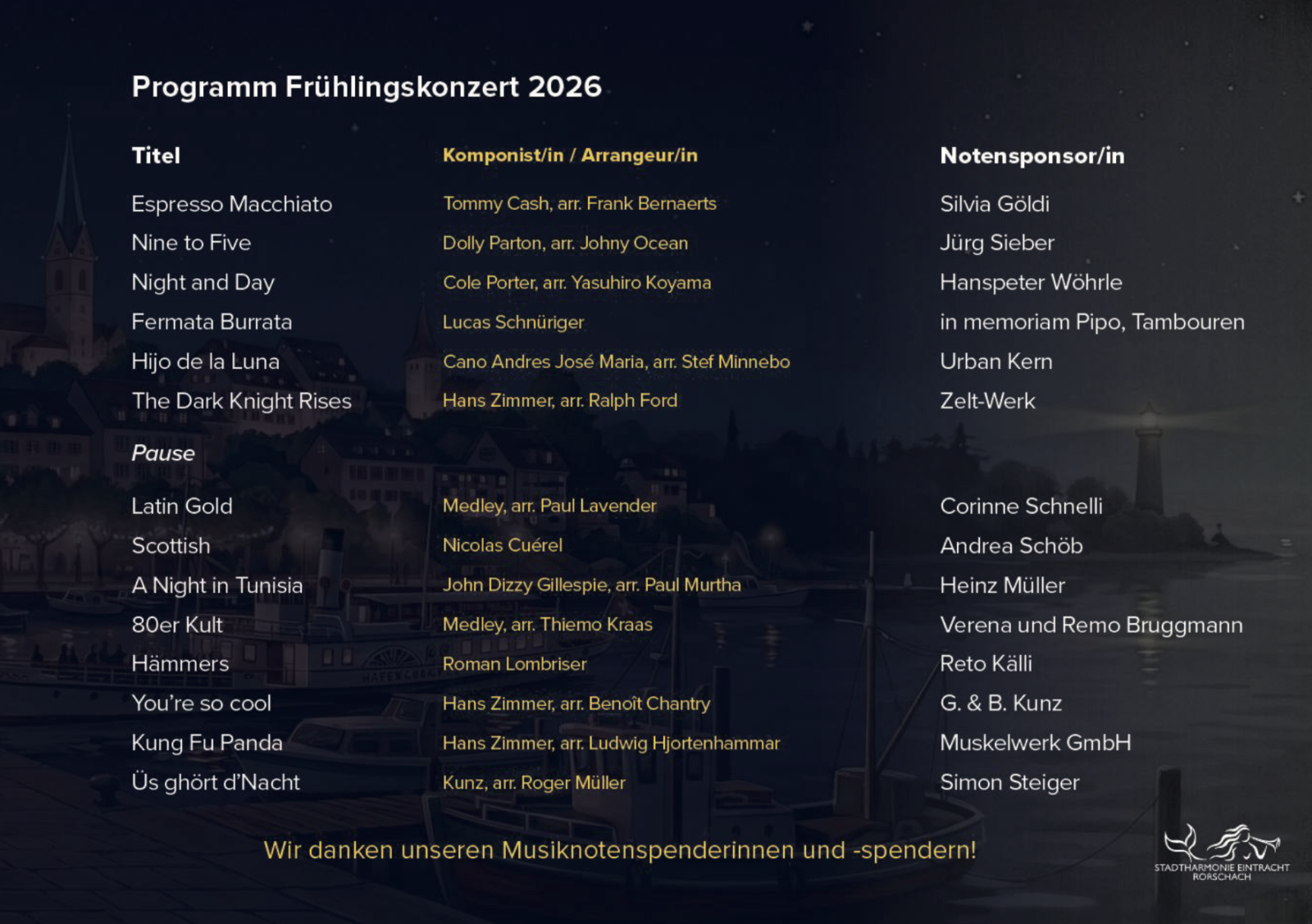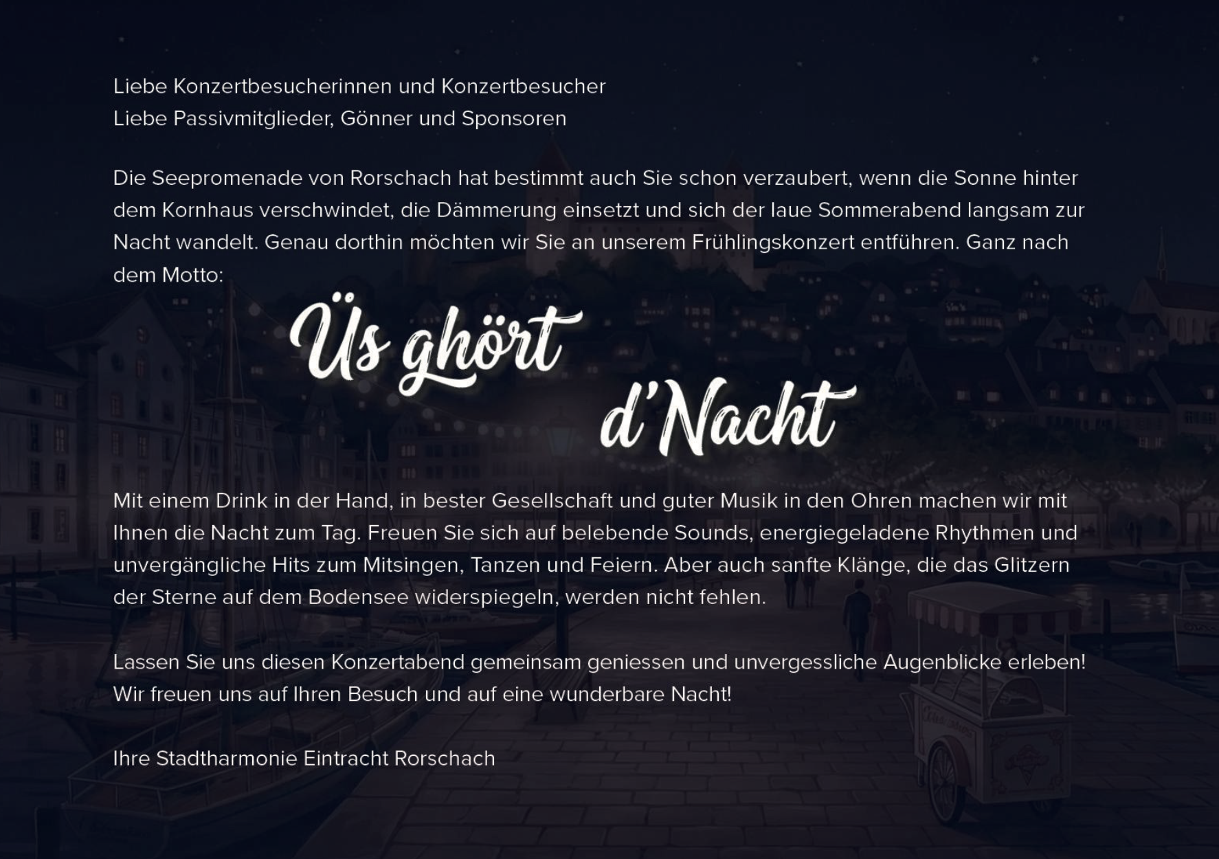 Die Stadtharmonie Eintracht Rorschach lädt am Samstag, 9. Mai 2026, zu ihrem Frühlingskonzert in den Stadthofsaal Rorschach ein. Unter dem Motto „Üs ghört d’Nacht“ steht ein Konzertabend, der die besondere Stimmung der Rorschacher Seepromenade musikalisch einfängt – vom sanften Übergang des Tages in die Nacht bis hin zur energiegeladenen Partystimmung.