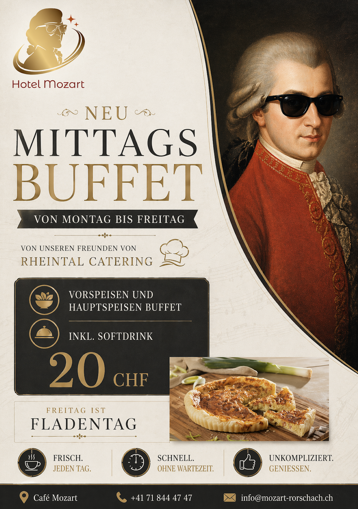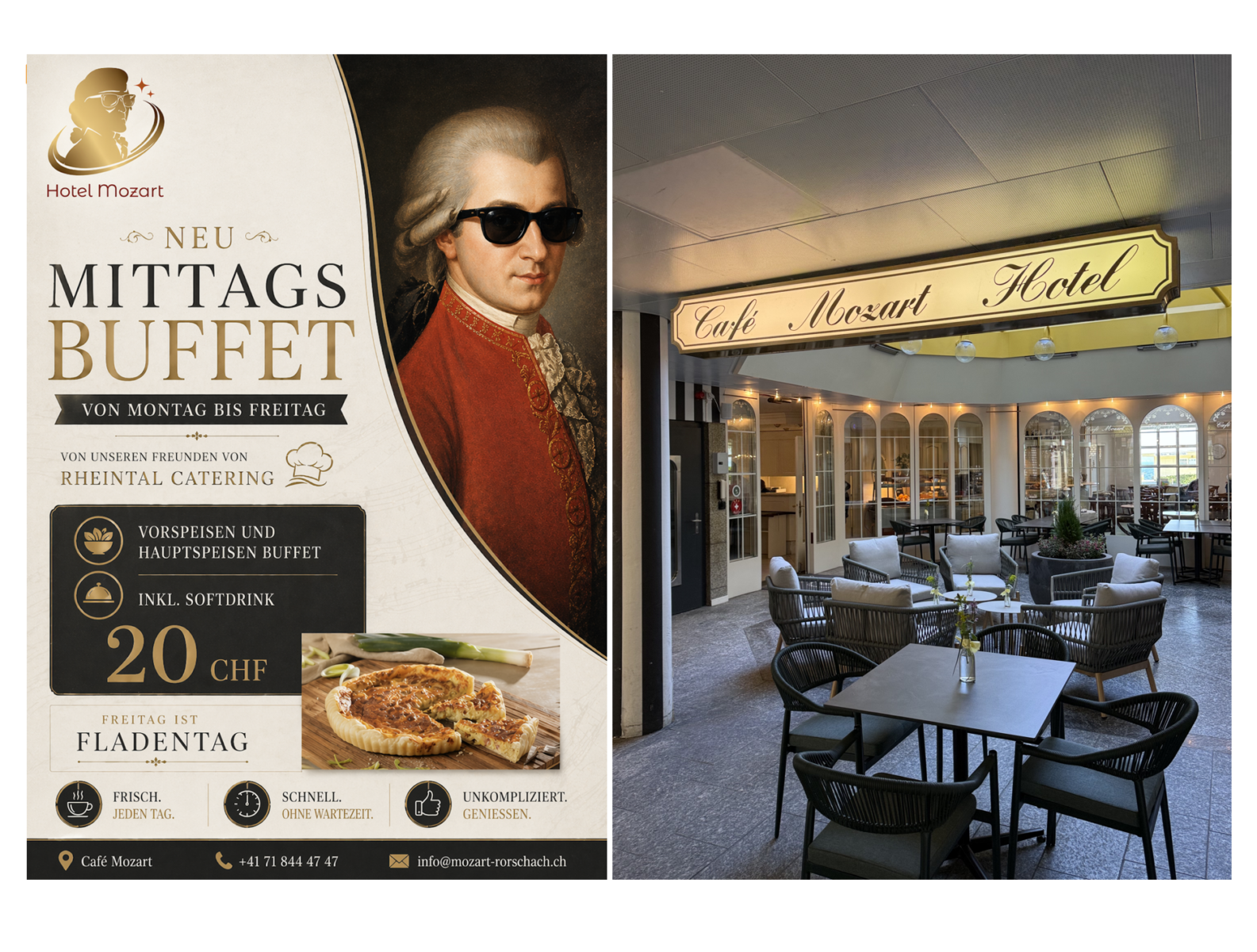 Gastgeber Kaspar Lenz hat sich entschieden, gemeinsam mit den Freunden von Rheintalcatering im Hotel Mozart in Rorschach ein Mittagsbuffet anzubieten. Vorspeisen und Hauptgangbuffet für 20.00 CHF, inkl. Softdrink. Und am Freitag ist jeweils Fladentag.