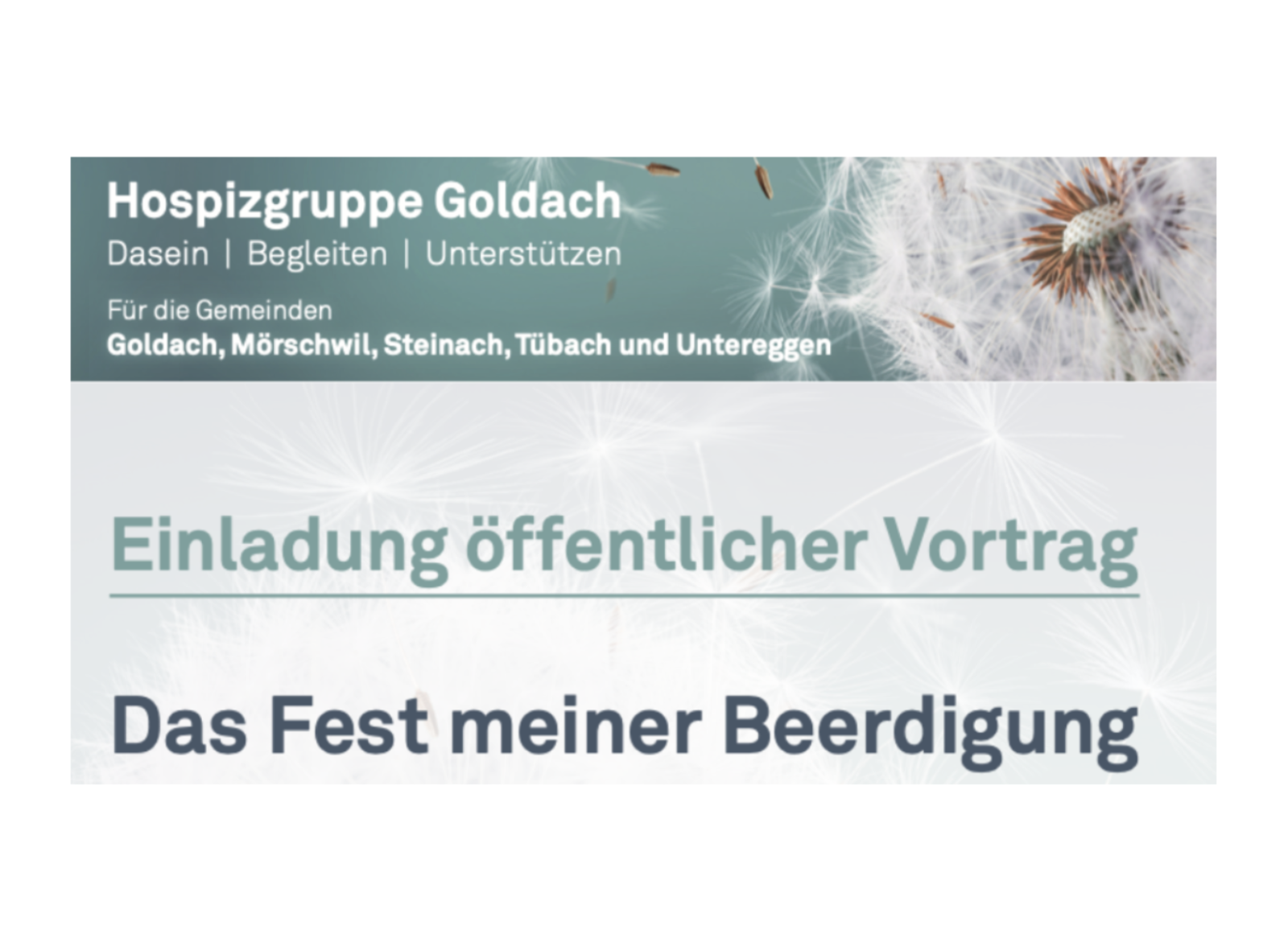 Die Hospizgruppe Goldach lädt heute Mittwoch, 29. April 2026, zu einem öffentlichen Vortrag ins Helios an der Industriestrasse 46 in Rorschach ein. Seelsorgerin Judith Romer-Popp wird als ehemalige Pflegefachfrau zum Thema „Das Fest meiner Beerdigung“ sprechen. Beginn ist um 14 Uhr, anschliessend wird ein Apéro offeriert. Mehr Infos findet man auf dem Flyer unten.
