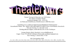 Beatrice Mock schreibt dazu: „Jeden Montag von 17.00 – 18.15 können Menschen ab 10 Jahren (Kinder, Jugendliche und Erwachsene) ein Theatertraining im Proberaum des Schlofftheaters Rorschach besuchen. Geübt werden Theaterskills…