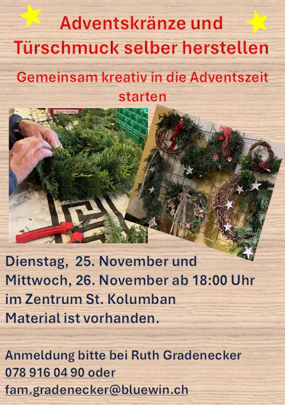 „Möchten sie auch einmal einen Adventskranz oder einen schönen Türschmuck selber herstellen? In der Woche vor dem 1. Advent haben sie die Möglichkeit dazu. Am Dienstag 25. November oder am Mittwoch 26. November wird sie Ruth Gradenecker ab 18:00 Uhr im Zentrum St. Kolumban in die Technik des Adventskranzens und des Türschmuck herstellen einführen.“