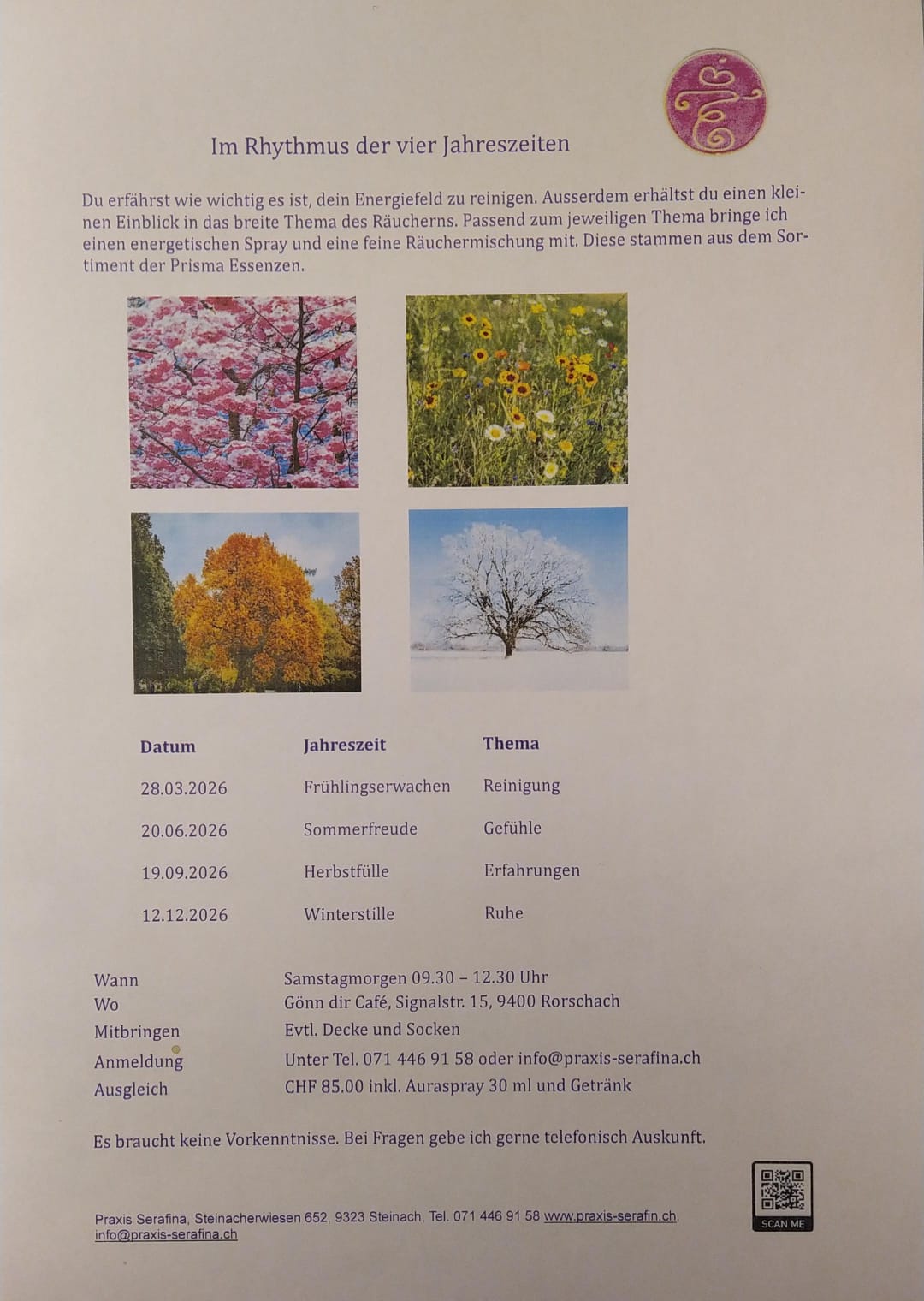 „Du erfährst wie wichtig es ist, dein Energiefeld zu reinigen. Ausserdem erhältst du einen kleinen Einblick in das breite Thema des Räucherns. Passend zur jeweiligen Jahreszeit bringe ich einen energetischen Spray und eine feine Räuchermischung mit. Diese stammen aus dem Sortiment der Prisma Essenzen.“ (Text/Plakat: pd)