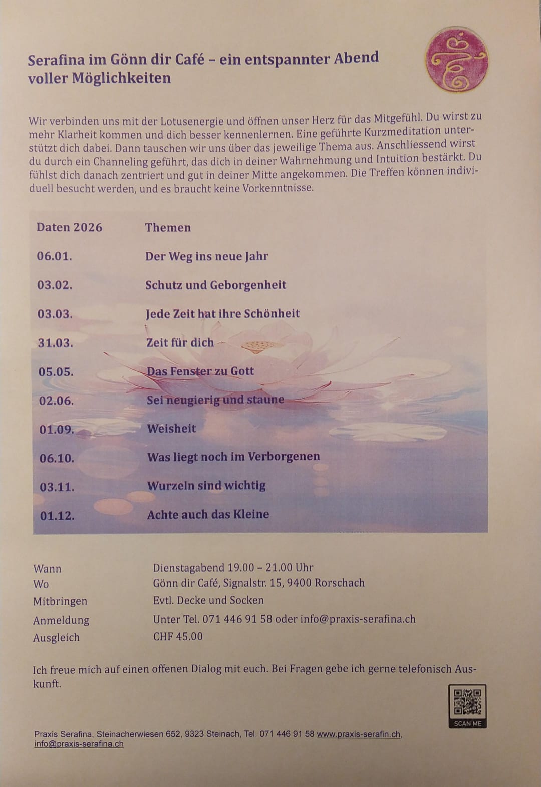 „Freue dich auf einen inspirierenden Dienstagabend. In einer leichten und angenehmen Atmosphäre begeben wir uns auf eine Reise… Wir beginnen den Abend mit einem Gespräch zum Thema. Dann folgt eine geführte Kurzmeditation, danach tauschen wir uns aus, und es können Fragen gestellt werden. Zum Schluss gehen wir nochmals in die Stille. Am Ende fühlen wir uns gut gestärkt, zentriert und in unserer Mitte angekommen.“ (Text/Plakat: pd)