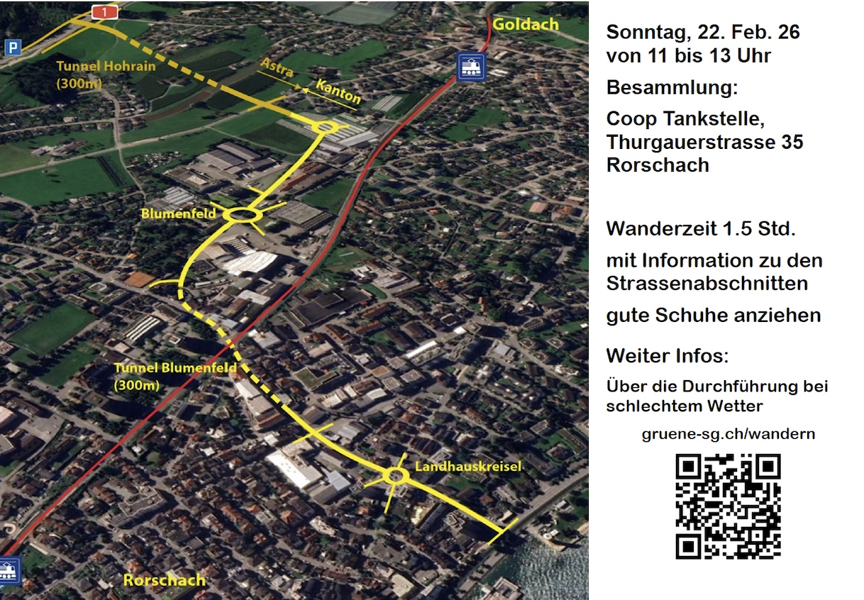„Grüne Rorschach“ schreiben dazu: „Am 8. März stimmen wir über die Megastrasse zum See ab. Wer sich noch über das wahre Ausmass diese Monster-Strassenprojekt ein Bild machen will, kann gerne an unsere Wanderung der Megastrasse entlang vom See bis in den Wittewald kommen. Diese findet am Sonntag, 22. Februar 2026, ab 11 Uhr statt. Treffpunkt: Coop Tankstelle Thurgauerstrasse in Rorschach.“