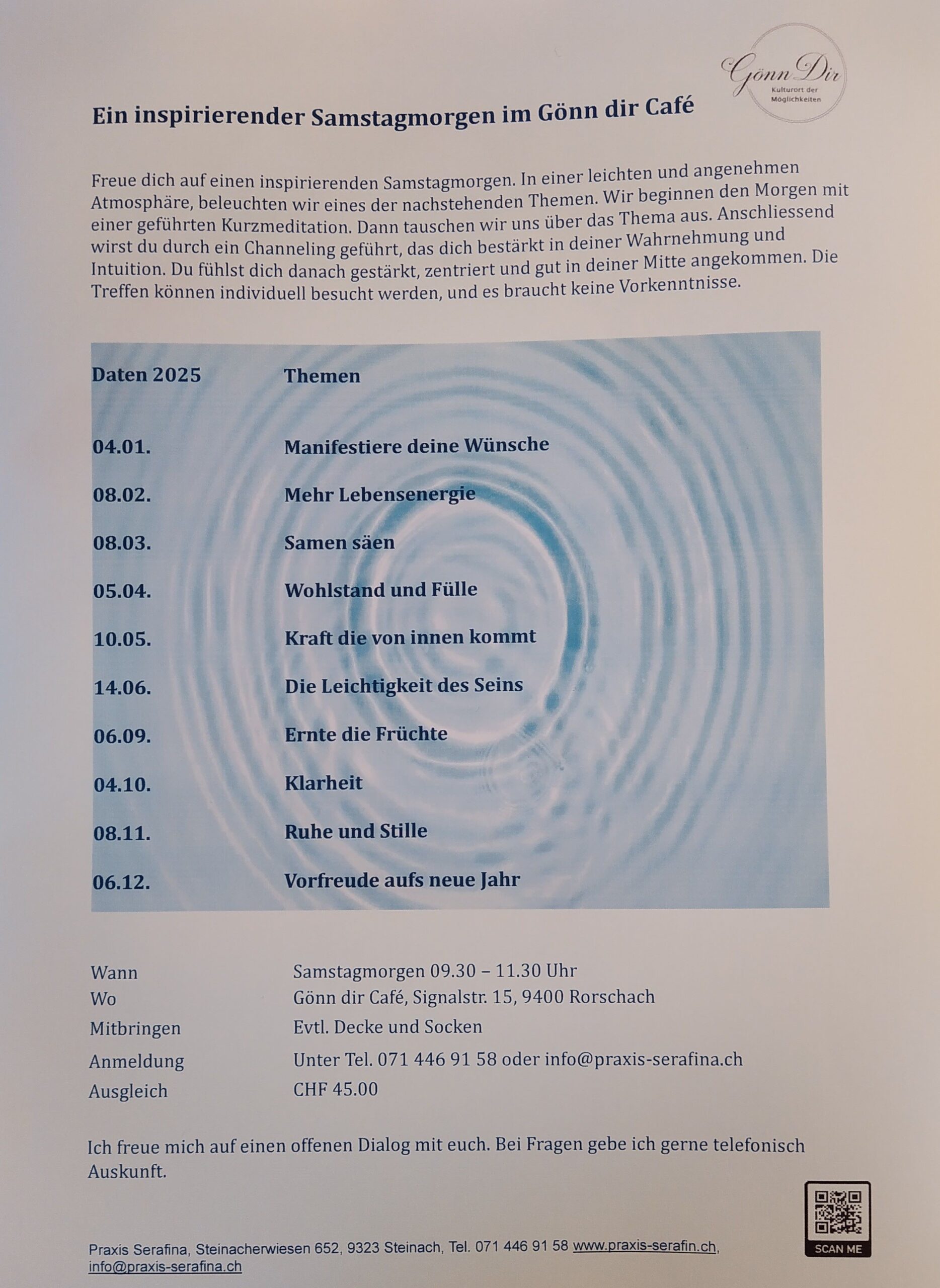 Beatrice Kopf schreibt dazu: "Freue dich auf einen inspirierenden Samstagmorgen zum Thema: was ist deine Lebensaufgabe. In einer leichten und angenehmen Atmosphäre begeben wir uns auf eine Reise…. Wir beginnen den Morgen mit einem Gespräch zum Thema. Dann folgt eine geführte Kurzmeditation, danach tauschen wir uns aus, und es können Fragen gestellt werden. Zum Schluss […]
