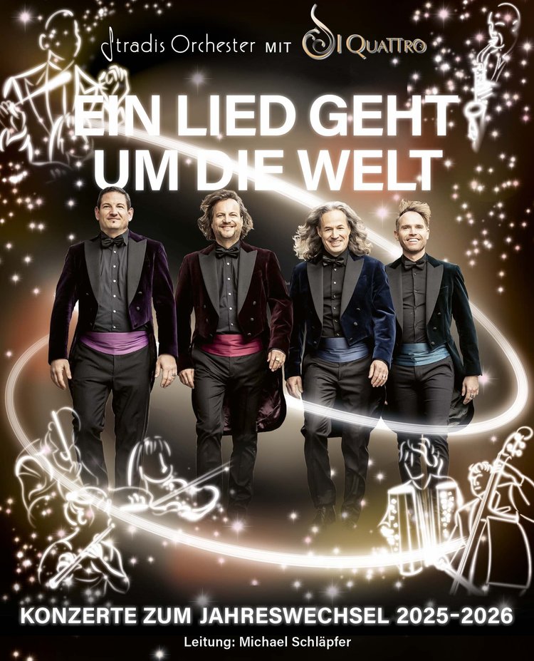 Silvesterkonzert «Ein Lied geht um die Welt» Zum Jahreswechsel lädt STRADIS ORCHESTER zu einem unvergesslichen musikalischen Feuerwerk ein. Unter der Leitung von Michael Schläpfer präsentiert Ihnen das professionelle Unterhaltungsorchester mit den gefeierten Schweizer Tenören I QUATTRO ein buntes Programm. Unter dem Motto «Ein Lied geht um die Welt» werden Sie auf eine spannende Reise von […]