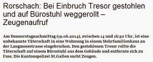 Gestern Nachmittag ist eine bisher unbekannte Täterschaft in eine Wohnung in einem Mehrfamilienhaus an der Langmoosstrasse eingebrochen. Die Kantonspolizei sucht Zeugen. Zur ganzen Pressemitteilung >> http://www.kapo.sg.ch/news/kapo/2014/06/rorschach–bei-einbruch-tresor-gestohlen-und-auf-buerostuhl-wegg.html