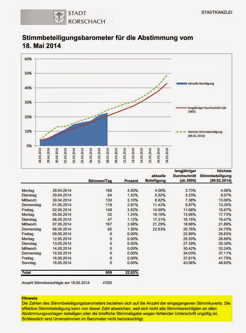 Gemäss der Stadtverwaltung Rorschach zeichnet sich für die Abstimmung vom 18. Mai 2014 eine hohe Stimmbeteiligung ab. Die Beteiligung liegt aktuell rund 2 Prozentpunkte unter jenem, der gut 10 Tage…