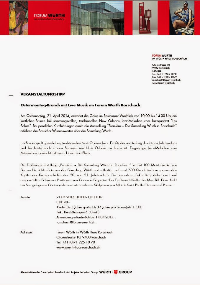 Wer sich am Ostermontag im Würth-Gebäude einen exklusiven Brunch genehmigen will, muss sich sputen. Heute ist Anmeldeschluss. Details siehe Bild.