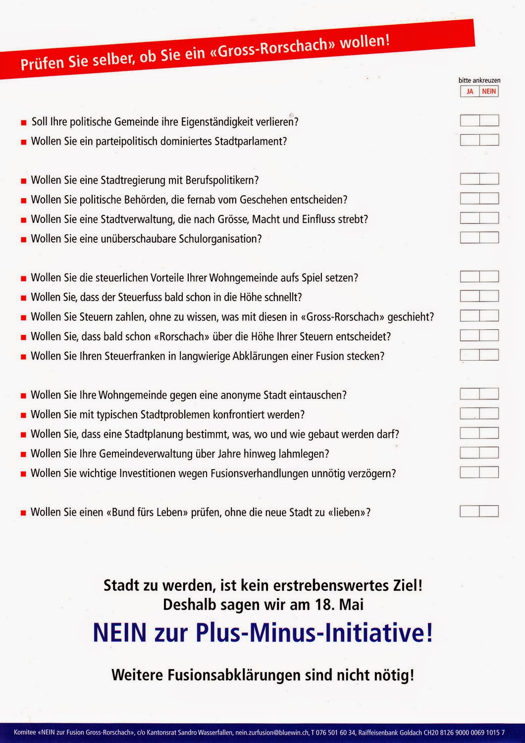 Nämlich die: Kann man so bescheuert sein, einen Fragebogen dieser Art überhaupt ernst zu nehmen? Und kann mir jemand erklären, weshalb dieses Flugblatt nur in Goldach und Rorschacherberg verteilt wurde?